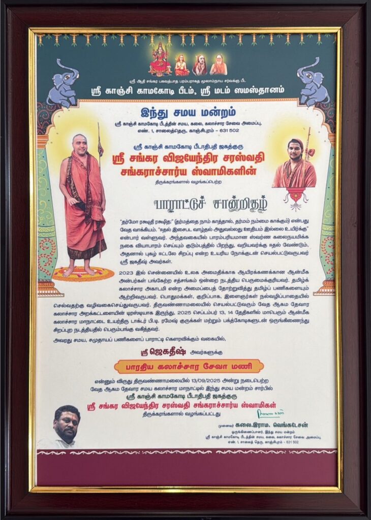 அவரது சமய, சமுதாயப் பணிகளைப் பாராட்டி கௌரவிக்கும் வகையில்,ஸ்ரீ ஜெகதீஷ் கடவுள் அவர்களுக்கு பாரதிய கலாச்சார சேவா மணி என்னும் விருதும், இளவரசு பட்டம் பி.டி.ரமேஷ் அவர்களுக்கு ஆலய ஆகம அறப்பணி செம்மல் என்ற விருதும் திருவண்ணாமலையில் சமீபத்தில் நடைபெற்ற வேத ஆகம தேவார சமய கலாச்சார மாநாட்டில் இந்து சமய மன்றம் சார்பில் ஸ்ரீ காஞ்சி காமகோடி பீடாதிபதி ஜகத்குரு ஸ்ரீ சங்கர விஜயேந்திர சரஸ்வதி சங்கராச்சார்ய ஸ்வாமிகள் வழங்கினார்.